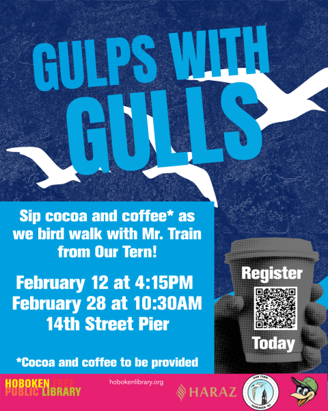 Speaking of ducks… Tomorrow morning is going to be gorgeous as well - more sun and even warmer temperatures.  If you like wildlife, come join us at 10:30 am with Hoboken’s resident bird expert who has partnered with the Hoboken library for “Gulps with Gulls”.  Click image to register (free - just so they can have enough coffee and cocoa)